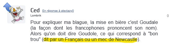 Pour expliquer ma blague, la mise en bière c'est Goudale (la façon dont les francophones prononcent son nom). Alors qu'on doit dire Goudole, ce qui correspond à "bon trou" (dit par un Français ou un mec de Newcastle).