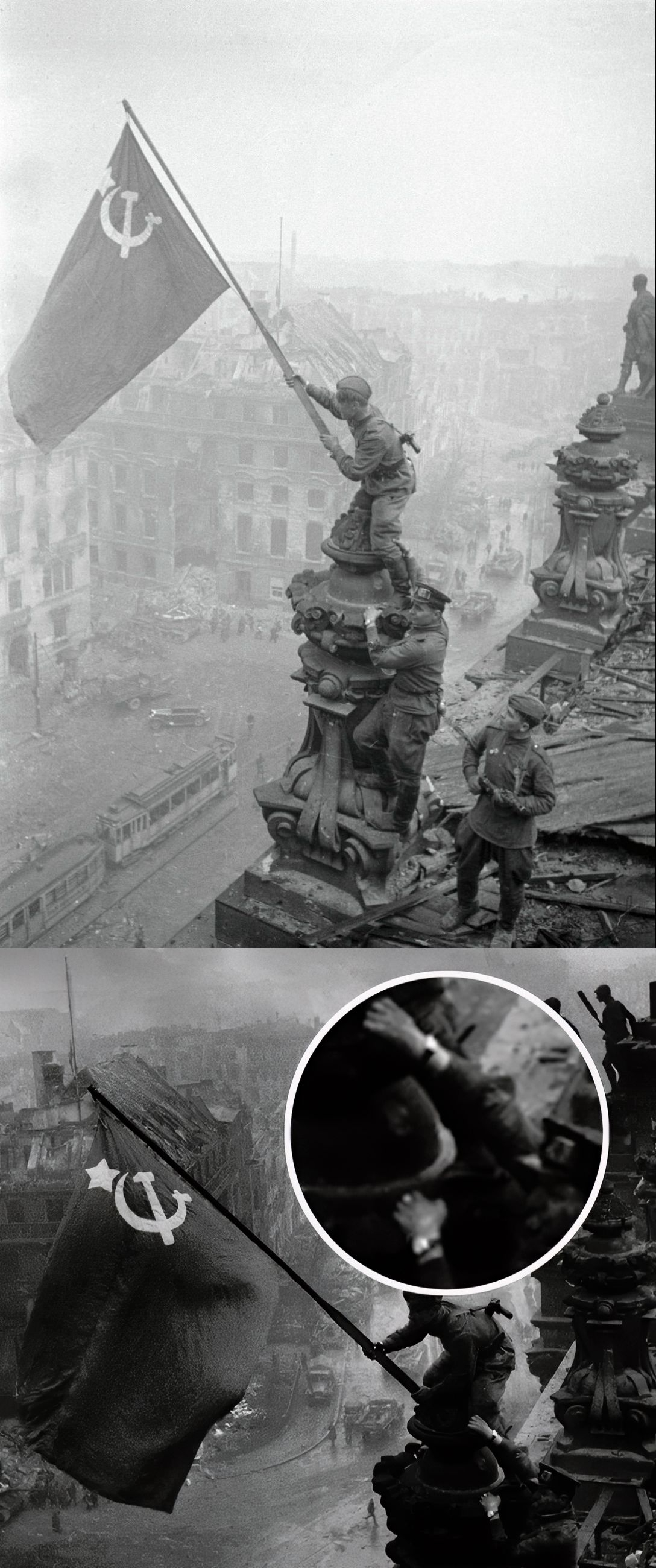 Il y a eu plusieurs fameux clichés pris à cette occasion. Mais le calme des rues avoisinantes fait penser que nous sommes bien après le 8 Mai 1945. Cette "reconstitution" servant la propagande stalinienne. On dénote toutefois un couac, sur une photo originale, le militaire placé entre les 2 autres possède DEUX montres, prouvant ainsi sa participation à un acte de rapine; les correcteurs de photo soviétiques s'empressèrent d'en faire disparaître une pour des raisons morales.