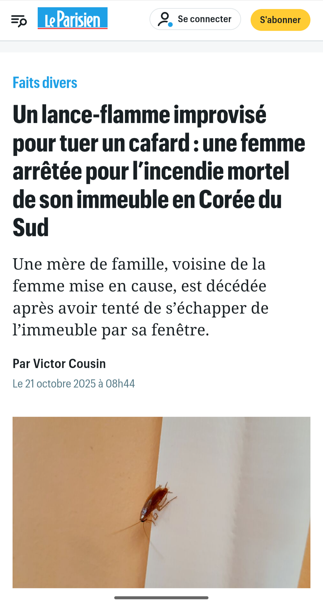 Où une sœur de Régis ? https://www.leparisien.fr/faits-divers/un-lance-flamme-improvise-pour-tuer-un-cafard-une-femme-arretee-pour-lincendie-mortel-de-son-immeuble-en-coree-du-sud-21-10-2025-G7ATQ3GOBNDYPJL3J6NROOKFD4.php