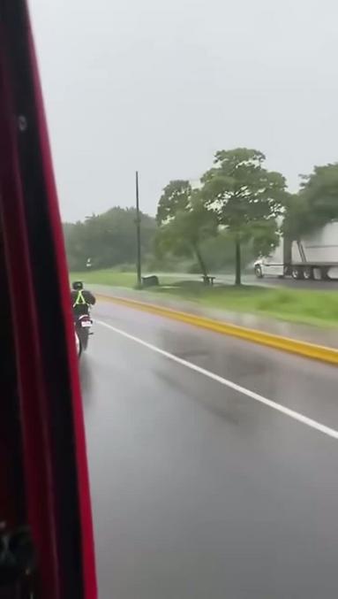 Karma ou pas : j'imagine mal un motocycliste conduire le doigt en l'air sous la pluie pour savoir s'il pleut encore. Plutôt, le conducteur/conductrice du véhicule rouge a dû l'arroser copieusement précédemment et, vue comme il/elle ne prend pas la peine de ralentir à la prochaine flaque, il/elle doit avoir autant de considération pour le Code de la route qu'un conducteur alcoolique pour les piétons et cyclistes de l'Ile d'Oléron...