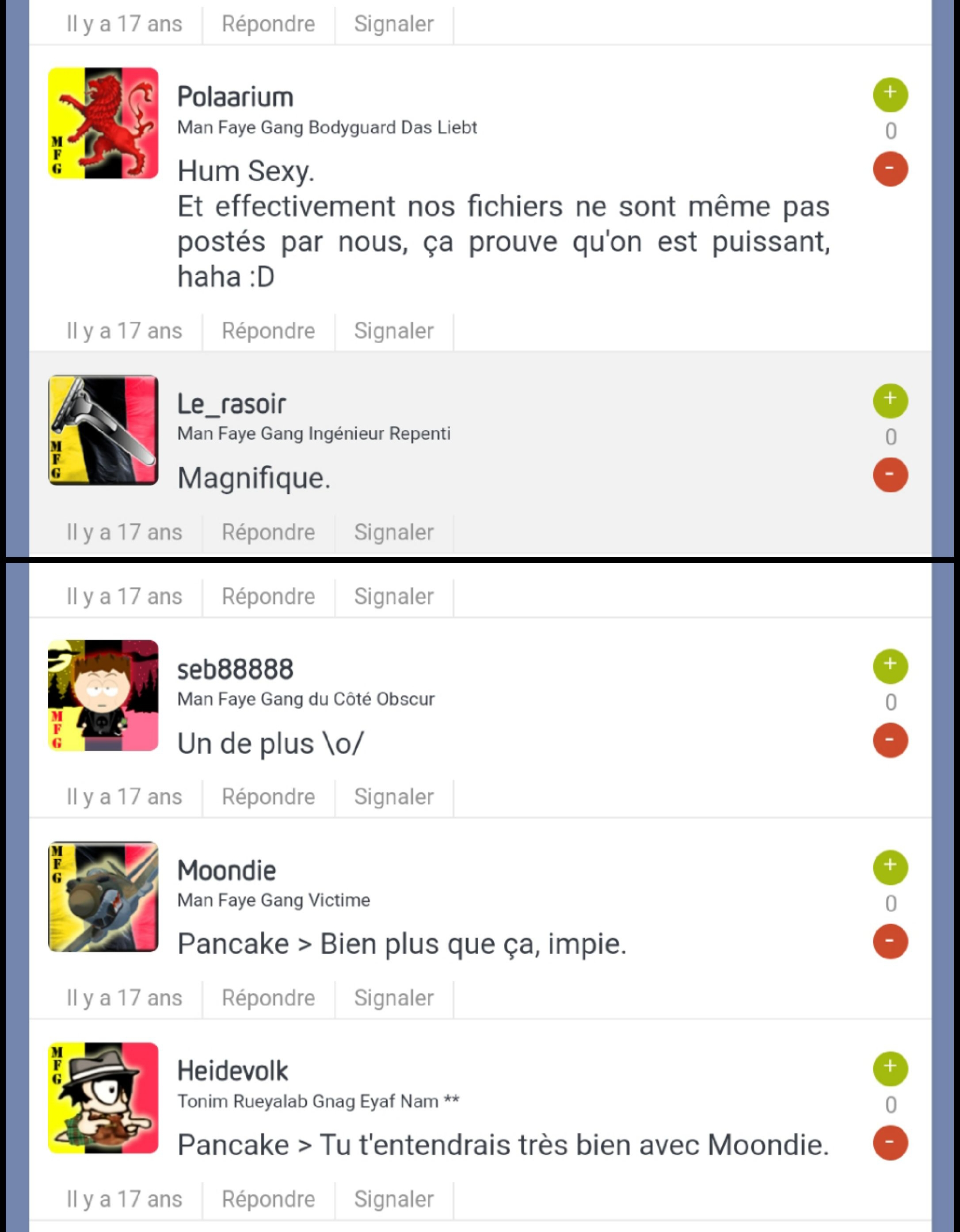 Des gens du MFG il y en a encore quelques uns d'actifs, je parlais surtout des fichiers sur lesquels on se réfugiait pour lancer un forum à nous seuls. Ça donnait des pages à plus de 1000 commentaires, et quand ça commençait à trop ramer on migrait sur un autre fichier.