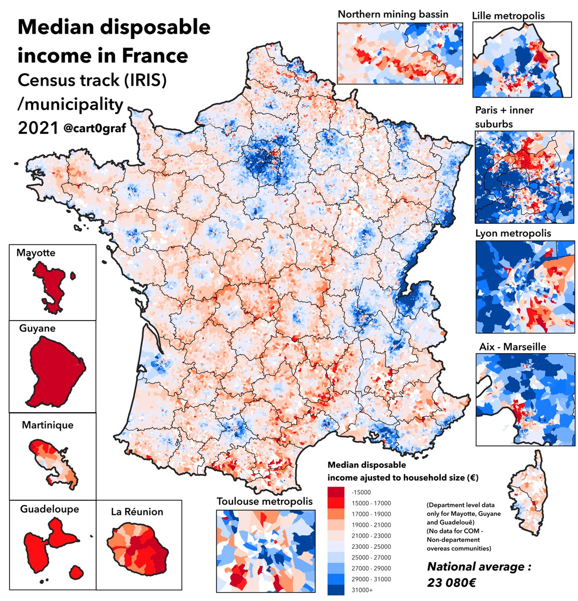Cette infographie représente le revenu disponible médian des ménages en France en 2021, ajusté à la taille du foyer, avec une moyenne nationale d’environ 23 080 € par an. Les couleurs vont du rouge (revenus faibles) au bleu foncé (revenus très élevés), ce qui permet de visualiser les inégalités territoriales à l’échelle fine des IRIS ou communes. On observe une forte concentration de revenus élevés dans les centres des grandes métropoles et certains littoraux (Paris, Lyon, Aix‑Marseille, Toulouse, etc.), entourés de couronnes périphériques plus pauvres. Le Nord et les anciens bassins miniers apparaissent largement en rouge, signe de difficultés économiques persistantes, tandis qu’une grande partie des zones rurales de l’Ouest et du Centre montre des niveaux de revenus modestes mais moins extrêmes. Les encadrés agrandissent plusieurs métropoles et confirment la juxtaposition de quartiers très riches et de quartiers populaires. Enfin, les cartes des territoires ultramarins sont presque entièrement rouges ou orangées, ce qui souligne que les revenus y sont nettement inférieurs à ceux de la France métropolitaine.