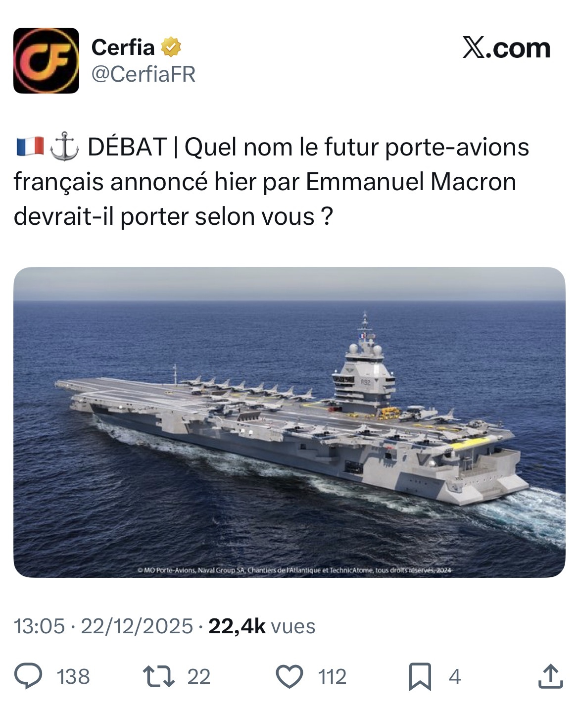 Le nouveau porte-avions annoncé par Emmanuel Macron pour succéder au Charles de Gaulle est conçu comme un porte-avions de nouvelle génération à propulsion nucléaire destiné à renforcer durablement la capacité de projection et de dissuasion de la France. Prévu pour entrer en service vers 2038, il sera nettement plus imposant que son prédécesseur, avec une longueur d’environ 310 mètres, une largeur proche de 85 mètres et un déplacement estimé entre 75 000 et 80 000 tonnes en charge. Il sera équipé de deux réacteurs nucléaires de nouvelle génération assurant une grande autonomie, une vitesse élevée et une endurance prolongée en opérations, sans dépendance au ravitaillement en carburant.