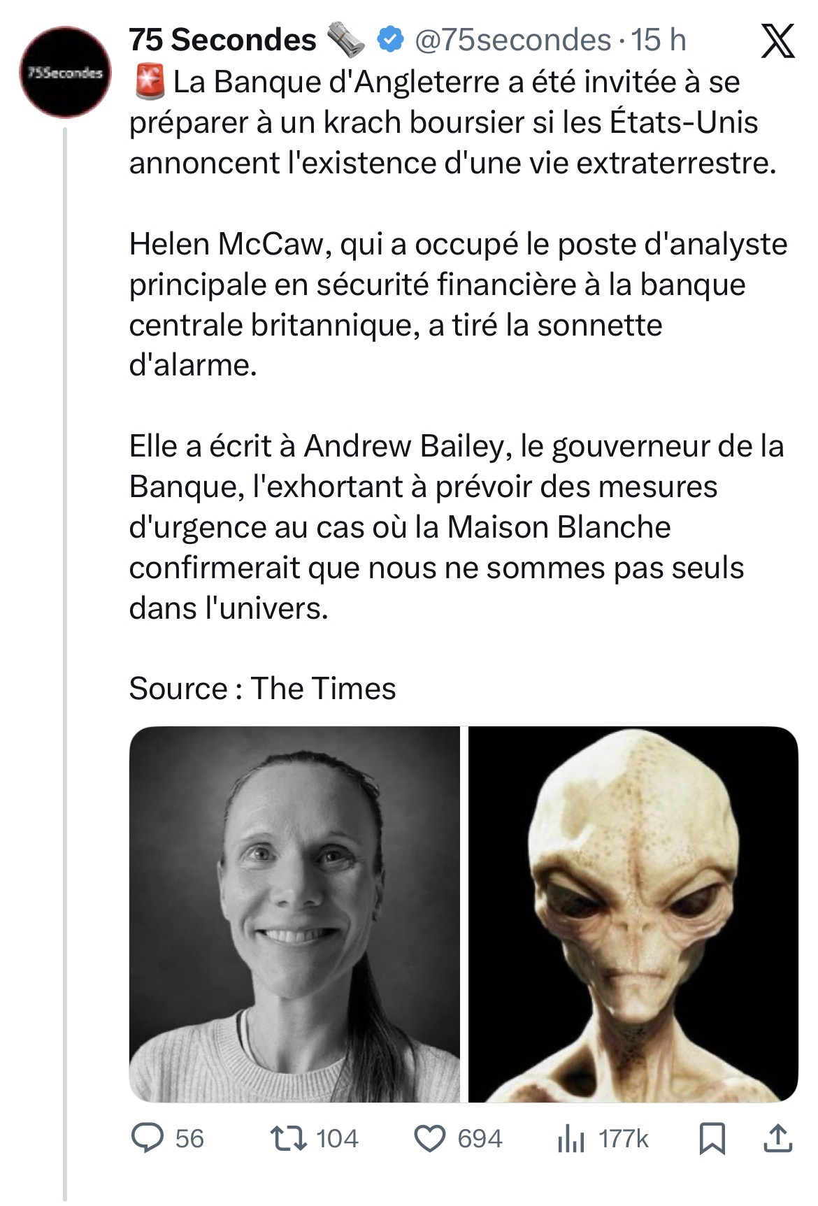 Un krach boursier pourrait survenir à l’annonce officielle de l’existence d’une vie extraterrestre parce que ce serait un choc informationnel total, imprévisible et sans précédent, capable de désorganiser en quelques heures la confiance sur laquelle reposent les marchés financiers. Une telle révélation remettrait en cause des croyances fondamentales, la hiérarchie des puissances, les priorités géopolitiques, scientifiques et militaires, et donc la valeur future de nombreux secteurs économiques, provoquant des ventes massives par panique humaine et algorithmique. Concrètement pour les gens, cela se traduirait par une chute brutale des marchés, une baisse de l’épargne investie et des retraites, une forte volatilité bancaire, un resserrement du crédit, voire des mesures temporaires de contrôle pour éviter des retraits massifs, pendant que les États tenteraient de garantir la continuité des paiements et des services essentiels. Cette alerte a été faite par Helen McCaw, ancienne analyste principale en sécurité financière à la Banque d’Angleterre, précisément parce que les autorités occidentales ont changé de posture depuis quelques années : reconnaissance officielle de phénomènes aériens non identifiés, publications de rapports gouvernementaux, auditions publiques et communication plus prudente sur ce qui est connu ou non. Pourquoi maintenant ? Parce que ces signaux rendent crédible, pour la première fois dans les cercles institutionnels, l’hypothèse d’une annonce brutale venue d’un État majeur, et qu’en gestion du risque systémique, ce n’est pas la probabilité qui compte le plus, mais l’ampleur des conséquences si le scénario se produit.