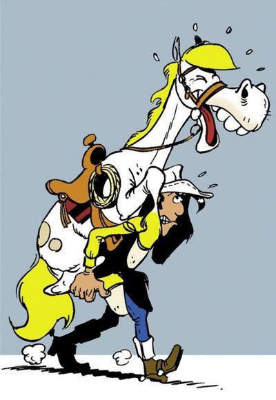 Le miracle de l'équilibre : Grâce à la rigidité de ses muscles et à la forme de la selle, il reste miraculeusement en place. La jument, sentant le poids de son cavalier mais ne recevant plus d'ordres, continue de galoper en tête.