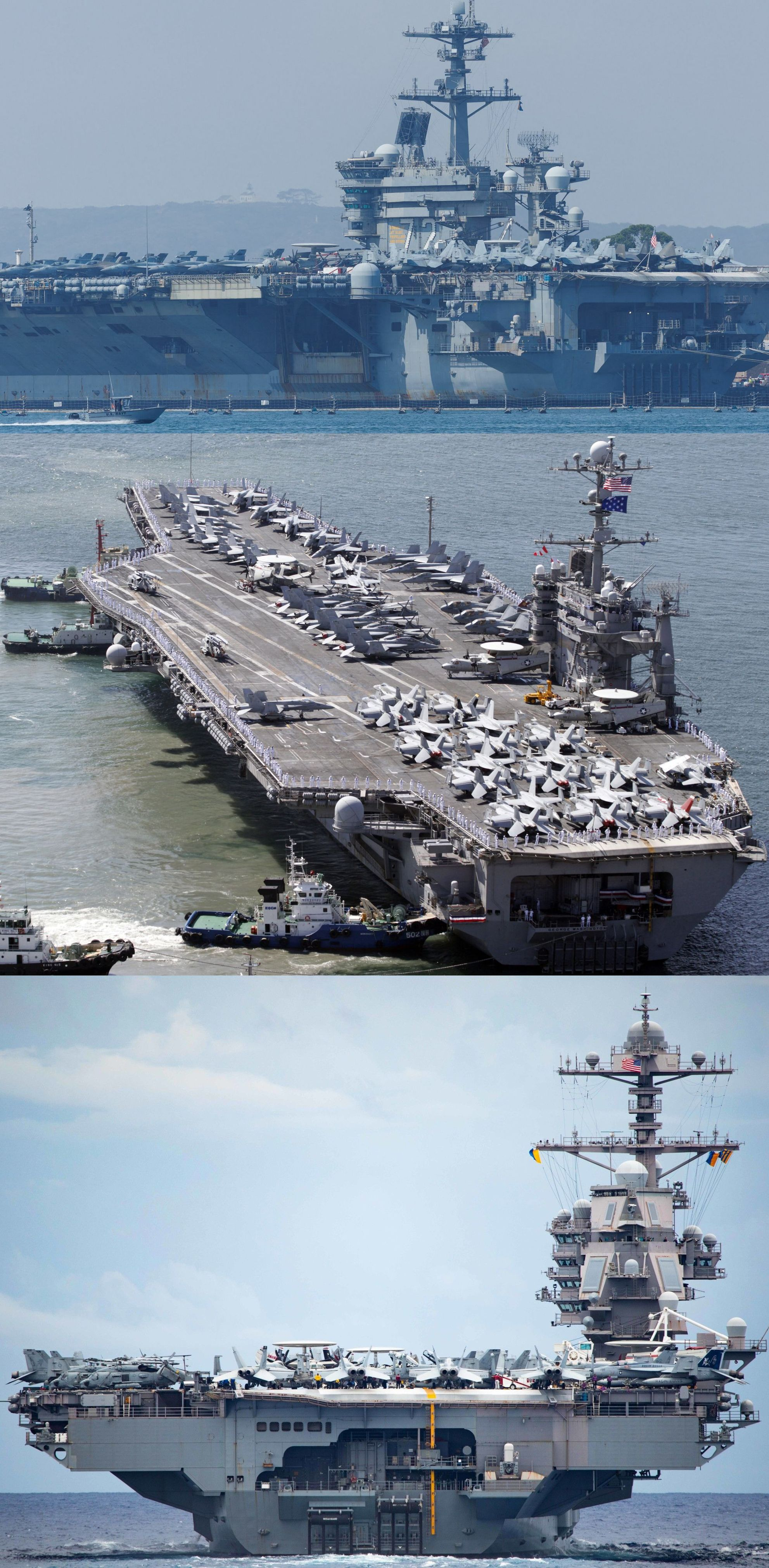 De haut en bas : USS Abraham Lincoln, USS Gerald Ford, USS George Washington. Ces 3 porte-avions, plus tous les navires et sous-marins d'escorte, croisent maintenant au moyen-orient, les rayons d'actions des avions et des missiles sont largement à portée de l'Iran. Leur puissance offensive est considérable.