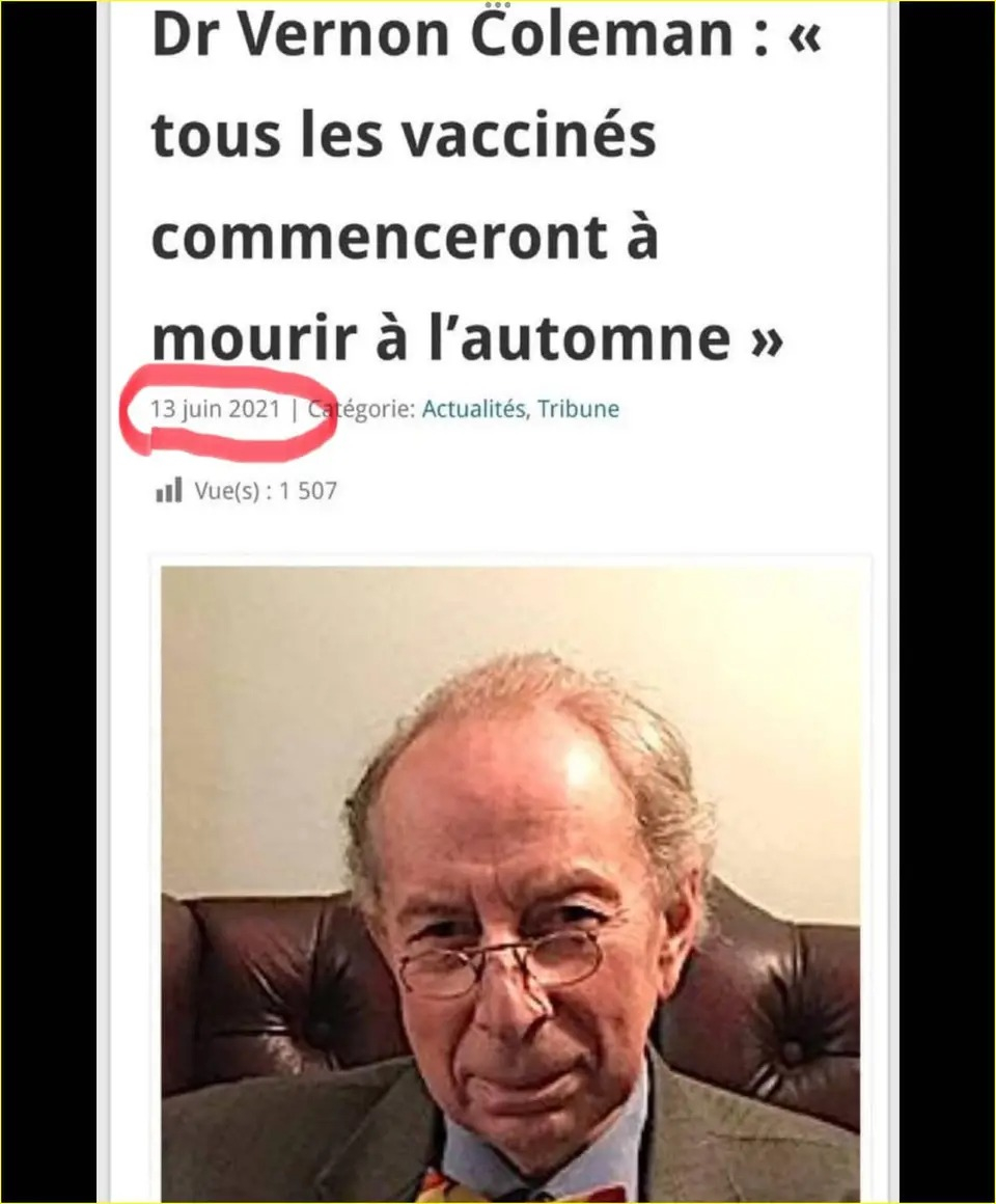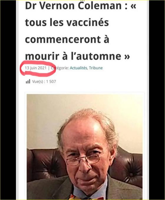 "Vernon Coleman prétend que la pandémie de Covid-19 et la campagne de vaccination pour y faire face sont l’œuvre d’une élite maléfique décidée à éliminer plus de 90 à 95 % de la population mondiale afin de promouvoir son Agenda 21 et la grande réinitialisation (en anglais, The Great Reset)."