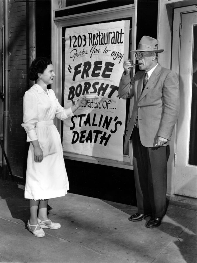 6 Mars 1953, à l'occasion de la mort de Staline, un resto new-yorkais offre un bortsch gratuit aux passants