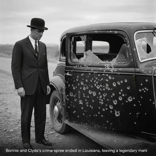 The posse, led by Frank Hamer, fired around 160 rounds in about 16 seconds, riddling the couple's car with over 100 holes.