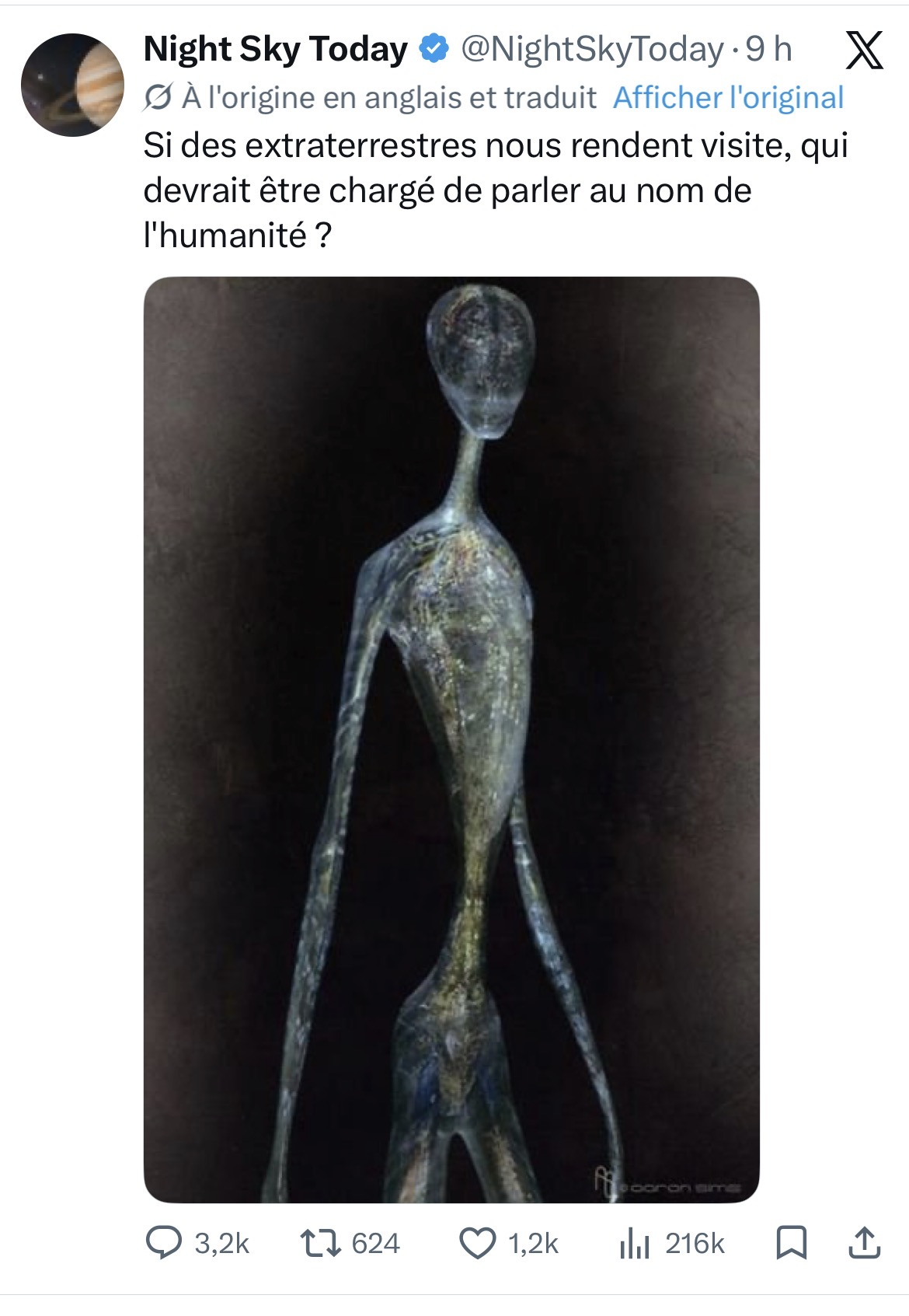 Et bien, en toute logique, qu'on le veuille ou non, c'est le dirigeant de l'armée la plus puissance/belliqueuse qui s'abrogera le droit de discuté, du coup, a l'heure actuel, ben ca sera Trump l'ambassadeur de l'Humanité. Bref, on est tous mort.